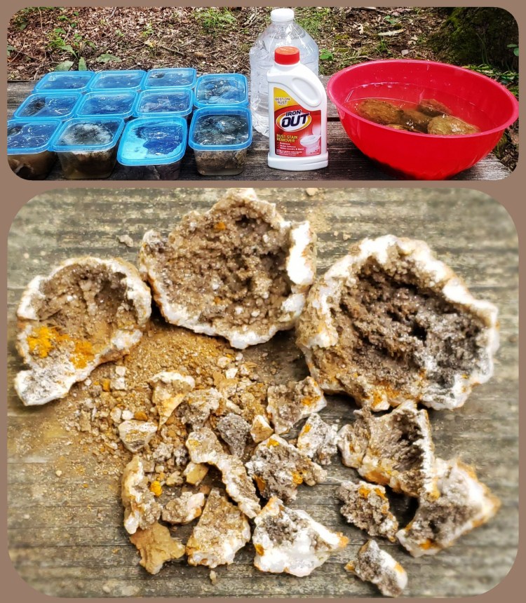 I created my own geode washing station on the picnic table. Every geode is incredibly unique. It was fun to crack them open to see what surprises were hidden inside. Most of them contained a lot of loose rust that needed to be washed out. Bleach & Rust Out worked well.