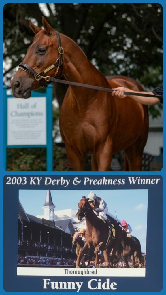 “Funny Cide is a champion American Thoroughbred racehorse who won the 2003 Kentucky Derby and Preakness Stakes. He is the first New York-bred horse to win the Kentucky Derby. He was an immensely popular horse and remains a fan favorite in retirement at the Kentucky Horse Park.”