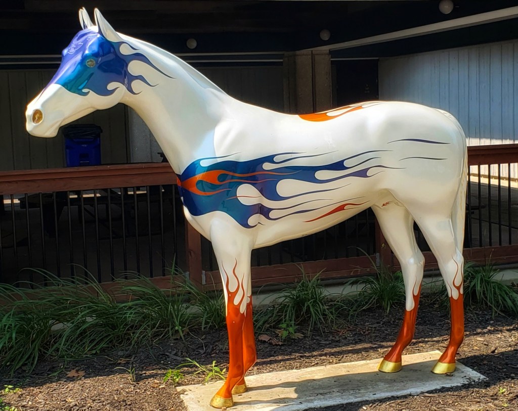 “Guests of the Iron Works Café are greeted by a horse of a different color. “Orion” was one of 79 fiberglass horses on display during the first “Horse Mania” public art project in 2000. Horse Mania returns to Lexington this summer in celebration of LexArts’ 50th anniversary and the 2022 Breeders Cup Championship at Keeneland.”