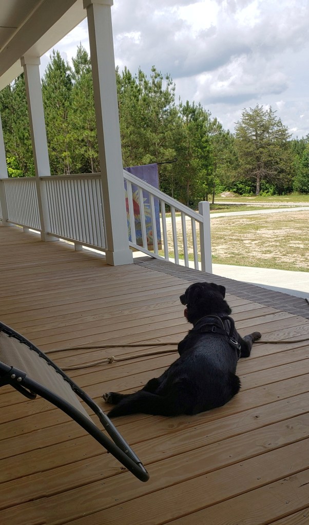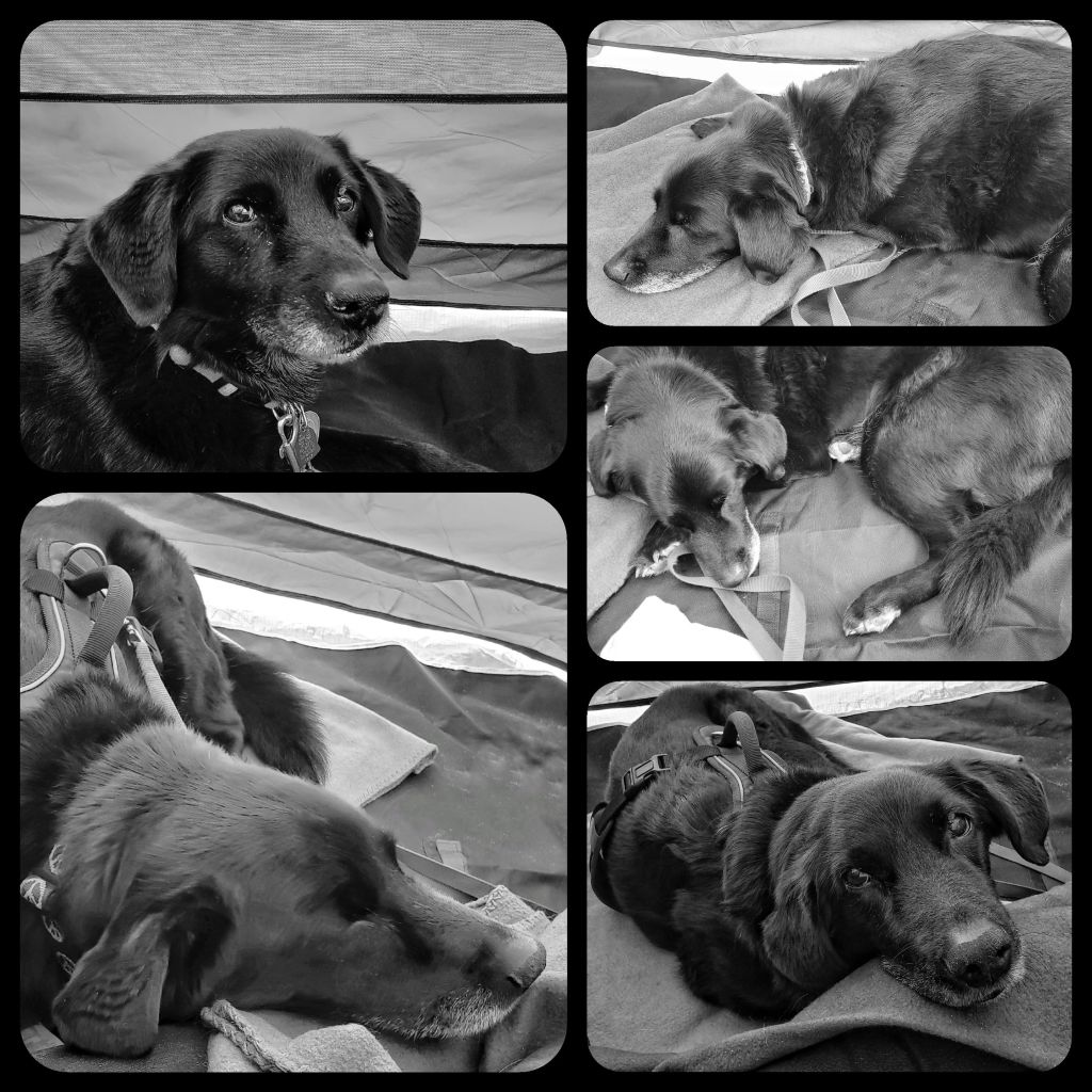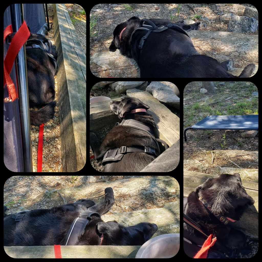The next morning, I couldn’t wait to leave! It had rained the night before, so I moved the tent & tarp out onto the sunny driveway to dry out & started putting things in the car.Maddie was tied to the picnic table.Five minutes after moving the tarp, I looked over to see if it was drying.