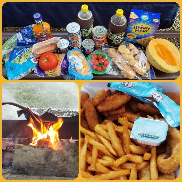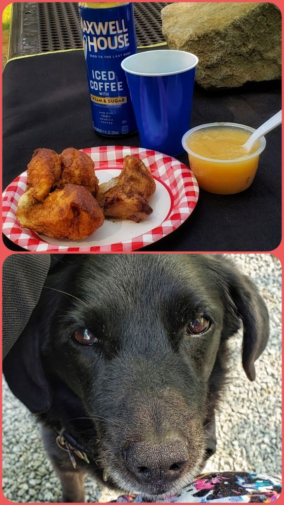 In my ongoing search for fresh local produce, I drove 20 minutes to a Farmers Market in Leitchfield, KY on Saturday morning. Unfortunately, some road construction delays caused a late arrival & most vendors had closed early due to the heat. There were 2 Amish farms waiting for their horses to return to take them home, so I was able to buy tomatoes, 2 fried pies & honey. I had hoped to buy more, but I was grateful for what I was able to get & it was all delicious. The market is held in the parking lot of the Grayson County Extension Service offices. It’s also the home of the 4-H office.4-H has been an important part of my life since I was a little girl, so it was fun to see the signwith the π logo on it.This was Sunday night & as usual, we were almost alone again. The Camp Hosts, Rick & Darlene were there, but most of the campers had already left.It had to happen sometime! π On Day #99, we had a rain delay for our next move. π€·ββοΈ I got up extra early to pack up before the expected rain, but it came in faster overnight. It stopped raining by mid-morning, but the tent was soaked & the MUDDY slope to the car was more slippery than ice! It was also raining at our next stop in Indiana. π₯΄ I decided to pack up & leave the next day instead. I was able to adjust my reservations, without any additional fees! πIf you don’t believe in Guardian Angels, you should roadtrip with Maddie & me! π By Monday night, we were the only tent campers left in our area. We were on a fairly main road that almost everyone uses, so I waved as people drove by us. As I was trying to decide what to do about supper, a neighbor walked up with a full bundle of firewood. Patrick & his wife were leaving in the morning & this was extra wood. Five minutes later, he reappeared with all the food in the top photo! They were cleaning out their camper refrigerator & thought I might enjoy it! π€ After eating 2 hotdogs & salad, I walked over to thank them again. At that point, they handed me an entire, untouched, fish dinner from a nearby restaurant! Yes, Virginia. There is a Santa Claus. π β£π€ΆTwo hours after I finished supper, the fire was still burning bright! I couldn’t leave it unattended & I didn’t want to drown it out, so I sat & listened to the chorus of cicadas & frogs & watched the fireflies flit by me. Maddie was sleeping peacefully on her bed, a safe distance from the fire. The night air was cool, so the heat from the fire felt great. Life is good. πFor breakfast on Tuesday morning, I enjoyed the cantaloupe & donuts gifted to me by Patrick the night before & planned out our travel day. I was almost finished, when I saw Patrick heading my way with a paper plate. It was 2 fried eggs, plus scrambled eggs! They didn’t know how I liked my eggs, so they made both for me! I literally started to cry. I had just met this wonderful man 12 hours earlier & I was overwhelmed with the kindness offered to me by him & his wife. We spoke for a few minutes & wished each other safe travels. A short time later, they drove by me to leave. Patrick’s wife was waving & wishing me good luck on my journey. Once again, I was extremely grateful for the kindness of strangers. π