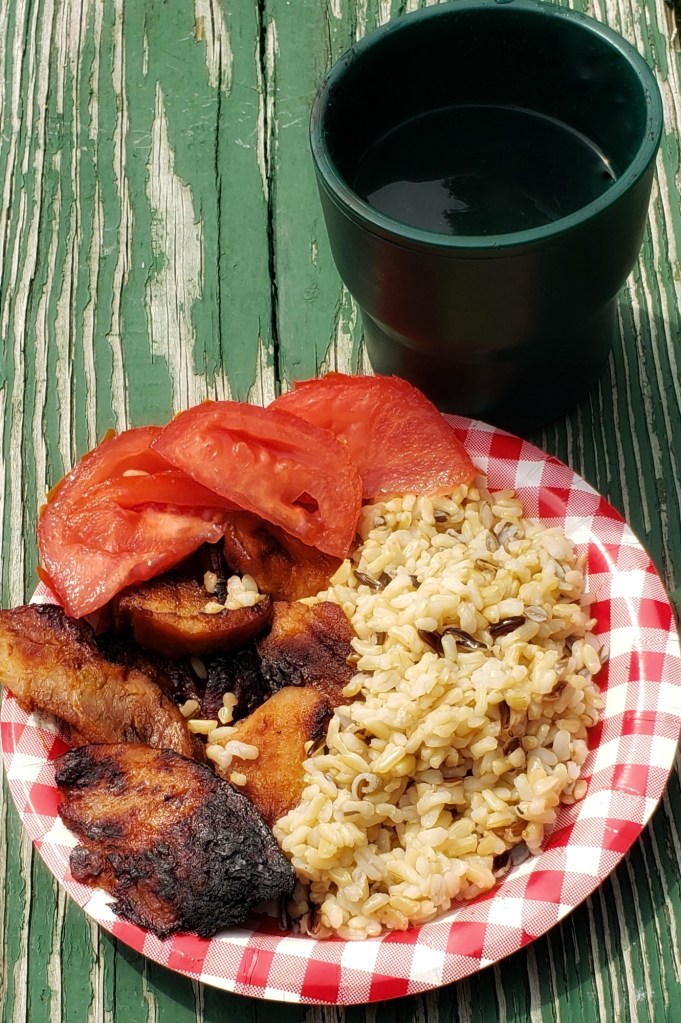 Almost this entire section of the lake is thickly covered in green algae. I’ve heard Canada geese, great blue herons, owls, cardinals, crows, blue jays, woodpeckers & many others. The condition of the lake is probably keeping a lot of the campers & boaters away. The wildlife inhabitants are loving it! The humans, not so much. π€·ββοΈ Maddie & I walked a short trail behind our campsite. I think this tree had the lead role in the Wizard of Oz!My current view from the tent. Maddie always gets herself tangled up within 3 minutes! πBreakfast this morningβ£ I had bought almost a pound of fully cooked ham & decided to grill it this morning. I glazed it with Mike’s Hot Honey, which is honey infused with hot chili peppers! I bought a tiny jar to try several weeks ago & now I wish I’d bought a large jar! It’s DELICIOUS & I’m not usually a fan of hot or spicy foods. I added red delicious apple slices & green onion cheese. And of course, coffee. Full disclosure: This is Wendy. π I haven’t been kidnapped and/or brainwashed! Most of my family & friends know that I’ve never really been interested in doing much cooking…until this adventure! Now, I’m LOVING it! I’ve always believed that food cooked outside tastes better & I’ve proven my point!I don’t have refrigeration & my cooler isn’t efficient, at all. If I splurge & buy something that needs refrigeration, I have to use it up very quickly. So, here’s my early supper! I finished up the ham & added a wild & brown rice combination, along with fresh, local tomatoes.