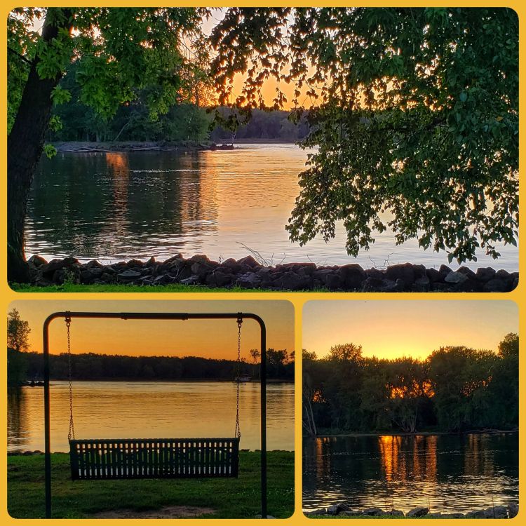 Beautiful β€ shaped leaves. I was sitting at the picnic table later in the afternoon, when I heard bald eagles squabbling. I looked up & there were 3 eagles flying overhead. As I watched them, this heart shaped cloud drifted over! I edited it slightly to brighten it up, but the shape is what I saw. It only lasted a minute or so. If the eagles hadn’t drawn my attention upwards, I’d have missed it.This was a reflection on the ground from my car door.The sunset was beautiful over the Mississippi River last night. I sat on this swing for a long time, talking with Mom. Maddie thought I’d lost my mind, again, but π€·ββοΈ